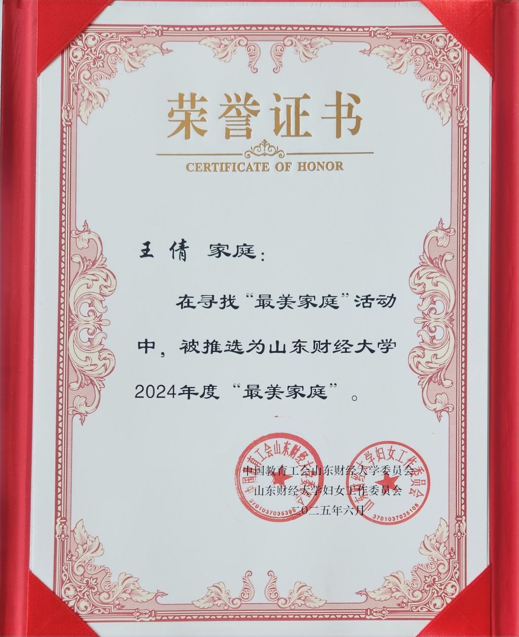 经评选,由我院工会选推的王倩老师家庭以优异成绩获得本次活动的“最美家庭”称号。王倩老师在教学科研一线辛勤耕耘的同时,十分注重子女教育,女儿于去年考取了北京大学。她在孩子成长过程中,始终秉持“读万卷书,行万里路”的教育理念,重视培养孩子的国际视野与家国情怀;注重引导孩子广泛阅读中外经典,并通过多次海外旅行,拓展孩子的世界观和跨文化理解能力;注重中华文化的传承,鼓励孩子参与公益活动,培养孩子的社会责任感。