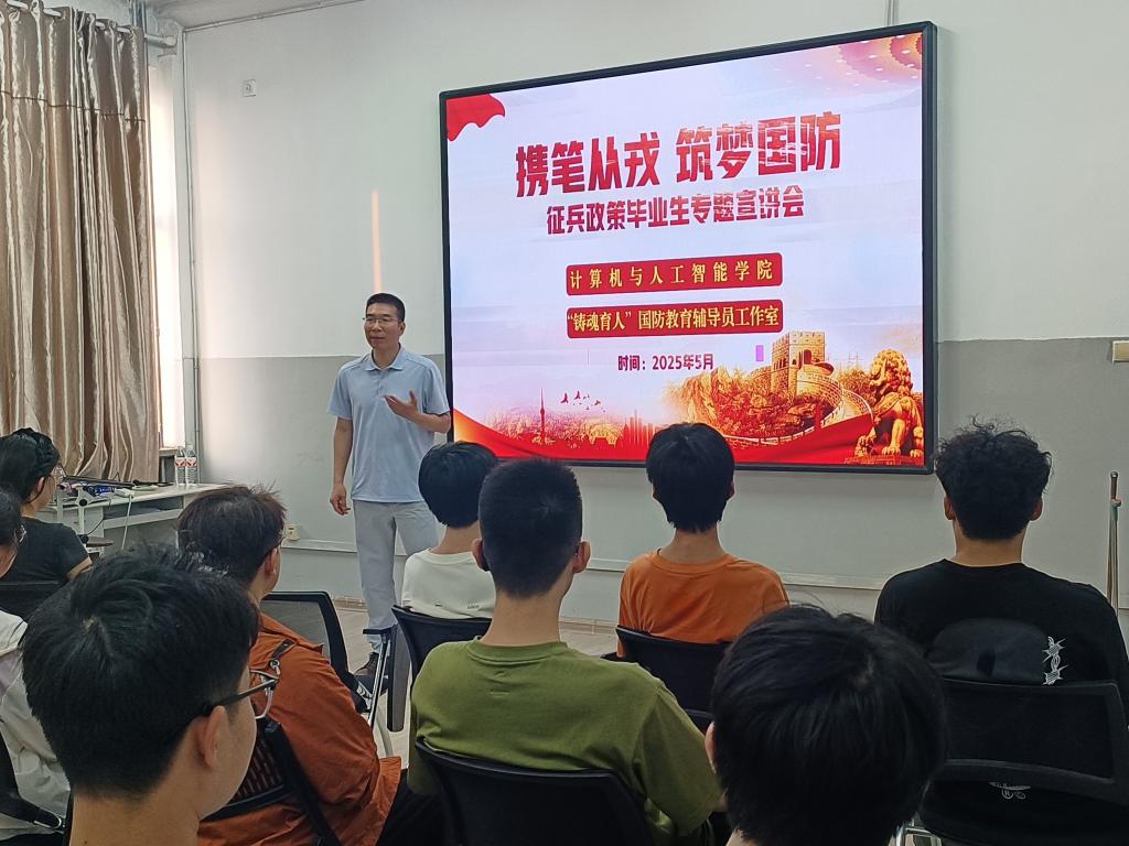 为全面落实学校2025年征兵工作要求,吸引更多高素质毕业生参军入伍,由学校党委学生工作部(武装部)主办,“铸魂育人”辅导员工作室、计算机与人工智能学院承办的“携笔从戎,筑梦国防”征兵政策毕业生专题宣讲会于5月16日在燕山校区举办。活动由“铸魂育人”国防教育辅导员工作室主持人、学院学工(就业)办主任任楠担任主讲,宣讲会通过线上线下同步开展,吸引了300余名应届毕业生及部分低年级学生参与。
