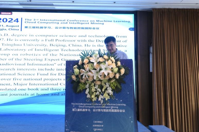 大会开幕式由会议主席上海交通大学王贺升教授主持,清华大学孙富春教授作为大会主席对会议历史以及本届会议情况进行了介绍。山东财经大学张云峰副院长代表主办方致开幕辞,对远道而来的与会嘉宾表示热烈的欢迎,对会议的顺利召开表示祝贺,并强调了机器学习、云计算与智能挖掘在当前及未来社会经济发展中的重要作用,并期待通过此次会议推动相关领域的技术交流与合作。