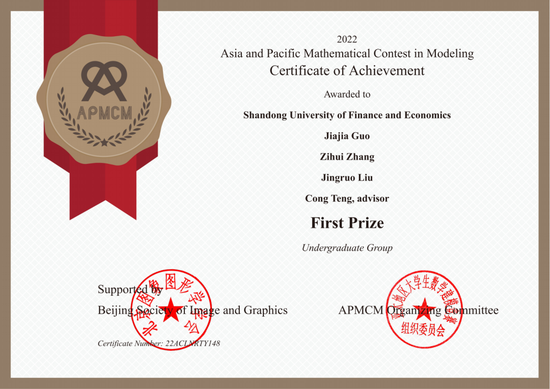 近日,2022年第十二届亚太地区大学生数学建模竞赛结束,山东财经大学统计与数学学院陈星宇、郭孜轩和计算机科学与技术学院王怡霖组成的团队在统计与数学学院任敏老师指导下荣获本届竞赛最高奖项——"亚太杯"创新奖。