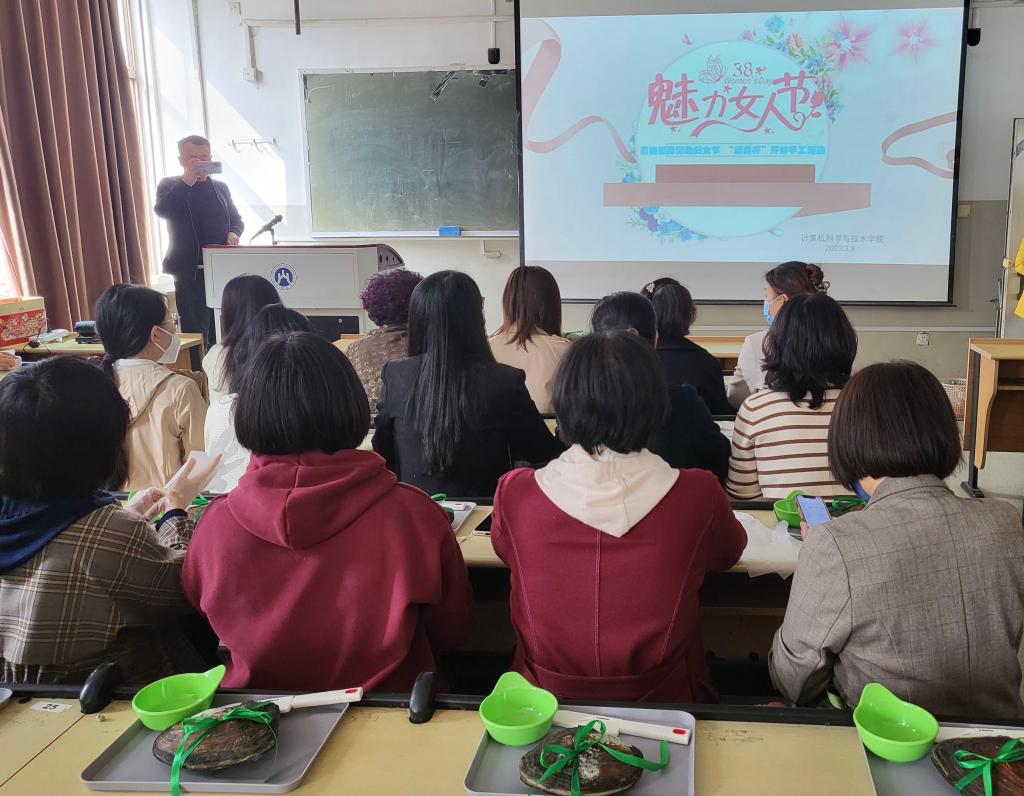 人间最美三月天,春花烂漫绽新颜。在第113个“三八”国际劳动妇女节到来之际,为丰富学院女教职工的精神文化生活,共同营造尊重女性、关爱女性的良好氛围,进一步凝心聚力,激励广大女教职工在学院建设、学校发展中发挥“半边天”的重要作用,计算机科学与技术学院组织全体女教职工开展“开蚌取珠”手工活动,学院党委书记杨春丽、党委副书记吕海霞、李云枝参加了活动。
