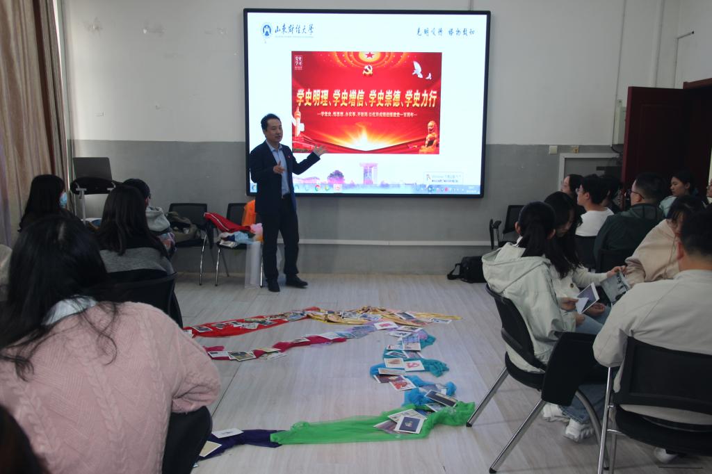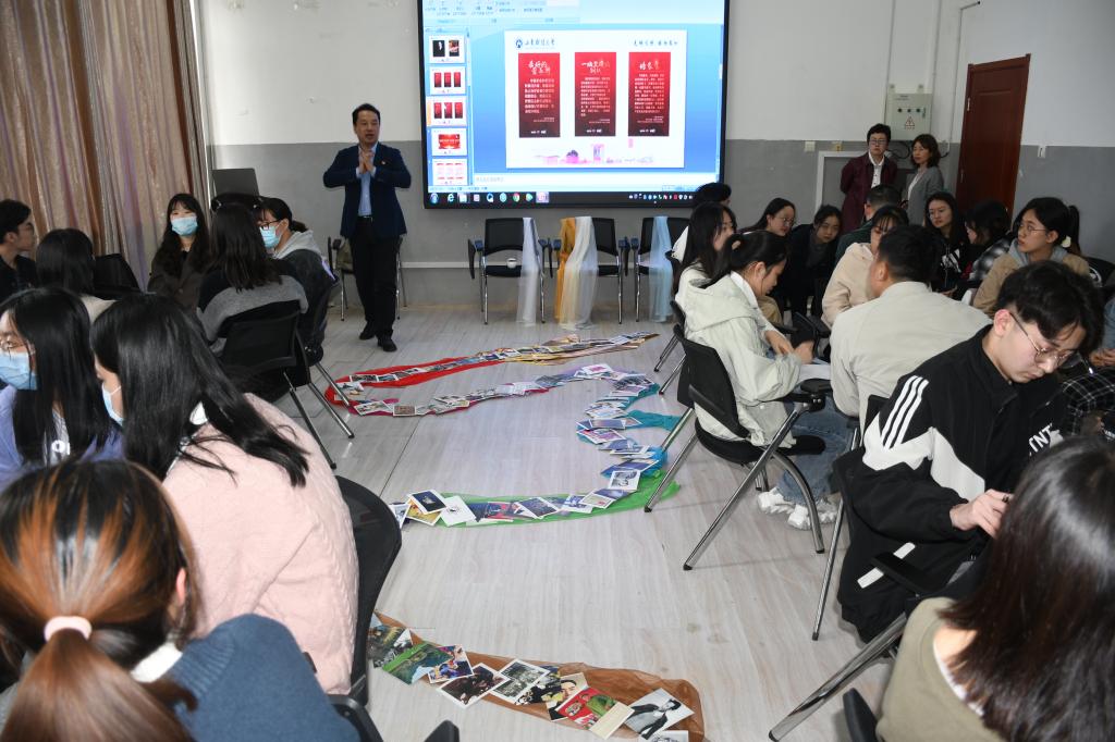 随着党课教学的循循深入,一条用彩纱铺置而成的跨越百年的“时光河流”呈现在师生面前。而在党的历史发展长河中出现的革命先驱、党史事件、灿烂文明和伟大成就等“红卡”则徜徉在这条“时光河流”中。刘洪涛让师生们慢慢品味和思索“红卡”及其背后的故事,并每人择取一张进行组内分享。从印有马克思肖像的“红卡”到“淮海战役”再到“港珠澳大桥”,从“鲜红的党章”到“沂蒙红嫂”再到“香港回归”。小小的“红卡”将百年党史巧妙地串联起来。在小组互动交流过程中他依次对每一张被选中的“红卡”进行解析,指出党的百年历史,就是一部不断推进马克思主义中国化的历史,是一部不断推进理论创新,进行理论创造的历史。中国共产党人秉承群众史观,为人民谋幸福、为民族谋复兴,这就是党的初心和使命。