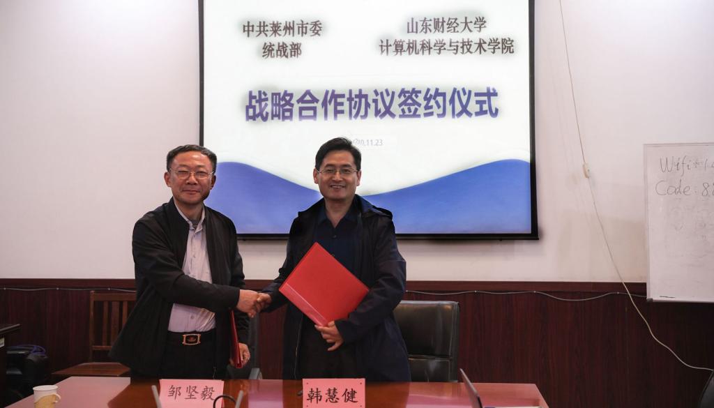 邹坚毅代表中共莱州市委统战部,韩慧健代表山东财经大学计算机科学与技术学院签署了战略合作协议书。根据协议,双方将在科技应用和推广、人才培养和引进两方面开展常态化合作。
