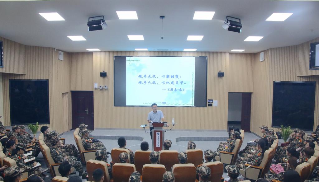 报告伊始,孟令军结合自身经历分享了读书的意义与价值。随后,他通过古诗词句,讲述了从中领悟到的人生哲理。先是通过诸葛亮《诫子书》中的“静以修身,俭以养德;淡泊明志,宁静致远”,引导同学们思考励精图治,不宜散漫的道理。随后通过王羲之的“后之视今,亦犹今之视昔”,探讨总结反思、吸取教训的价值。其次,通过子贡问时、北宋宰相富弼、唾面自干的故事向新生们讲述了包容的意义。通过《周易·彖》中“观乎天文,以察时变;关乎人文,以化成天下”,介绍了文化的起源,深刻阐释了当代大学生责任担当意识的重要性以及时代赋予当代学子的历史使命。