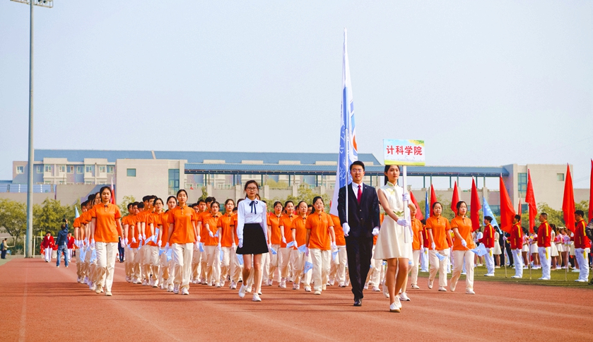 校运动会开幕式于九时整正式开始,国旗护卫队、花束队、各学院代表队依次出场。我院方阵队由48人组成,他们身着橙色运动服,手持院旗,伴着整齐的手势、划一的步伐昂首挺胸地走过主席台。