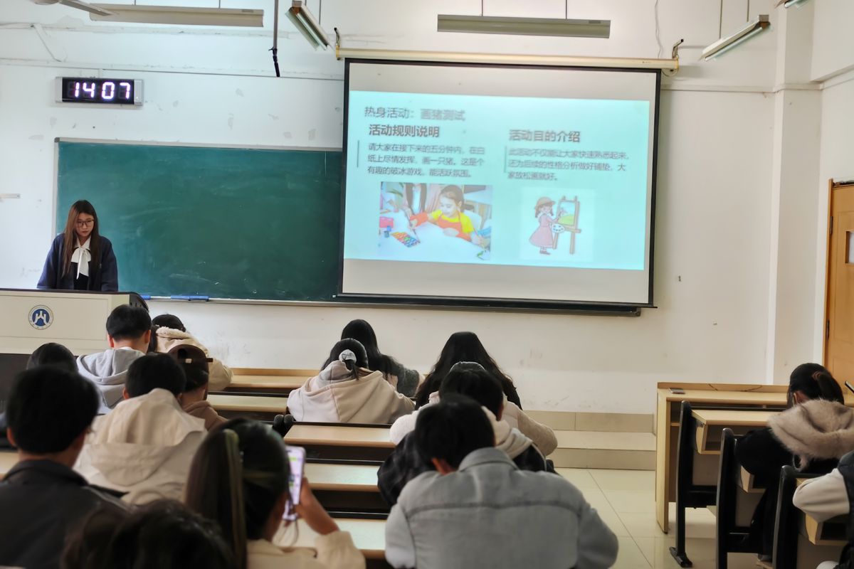 两周的室内培训聚焦理论知识储备与趣味体验,除了围绕MBTI人格类型分析帮助学员精准认知自我、理解他人差异,针对大学生心理健康现状、常见心理困扰展开案例剖析与数据解读,系统讲解情绪疏导、压力缓解的实用方法外,还设置了趣味心理测试环节。通过轻松有趣的测试互动,朋辈志愿者们在自我探索中加深了对心理知识的理解,同时增进了彼此间的交流,为后续开展朋辈沟通积累了实践经验。