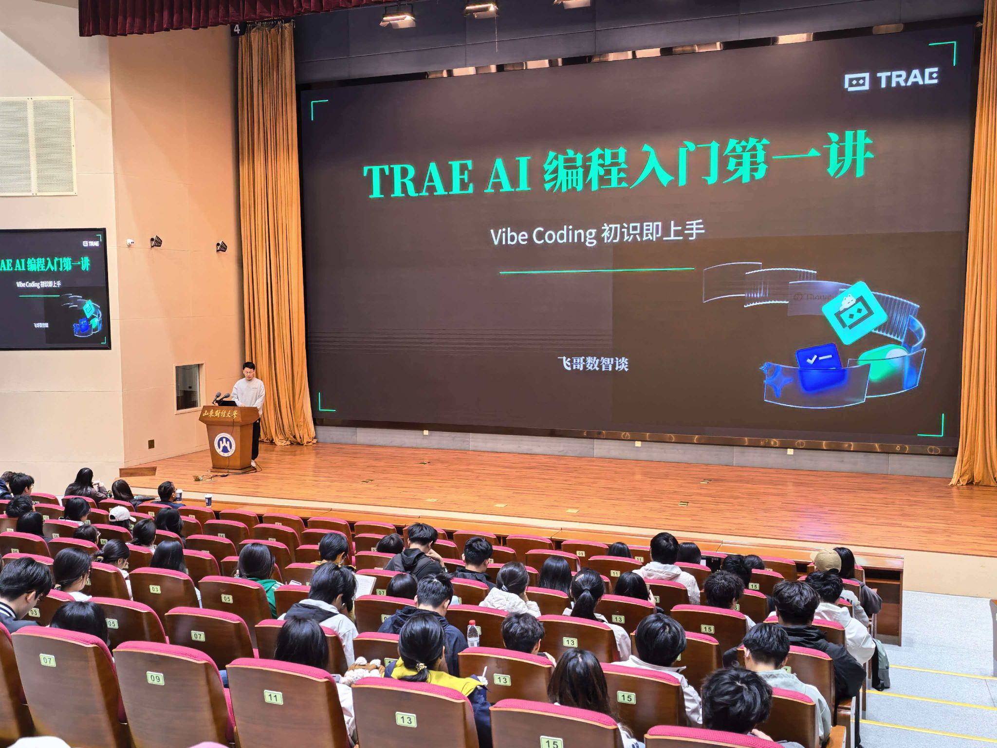 4月9日,主题为“财智校园,AI同行”编程黑客松系列赛前培训首场讲座在章丘校区图书馆报告厅举行,字节跳动AI原生编程IDE——TRAE团队带来“Vibe Coding初识即上手”主题分享,特邀嘉宾TRAE Friends@济南 Fellow、AI·Spring社群发起人董鹏飞担任主讲,计算机与人工智能学院副院长崔超然,团委书记李晨露,300余名师生参加活动。
