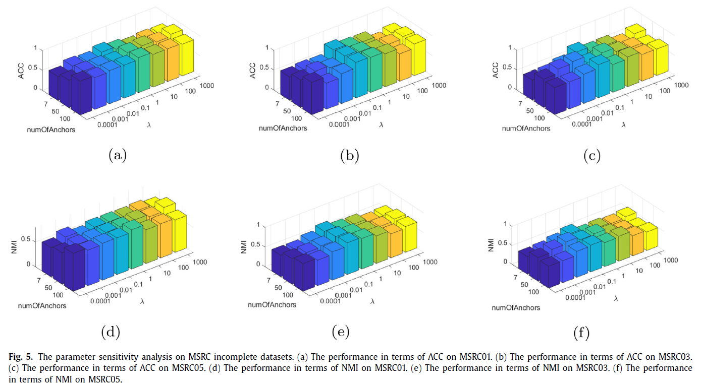 本文提出了一种名为基于锚点图的自加权不完整多视图聚类法(Auto-weighted Sample-level Fusion with Anchors forIncomplete Multi-view Clustering, ASA-IC)。该方法基于锚点图,提出了一种选择锚点的策略,可以用在完整多视图数据上,同时也适用于不完整多视图数据;通过设计了一种在样本层次上进行融合的方案,以简单有效的方式来减轻缺失数据对聚类结果的影响。在融合各视图信息的过程中,为每个样本自适应地学习各视图的相应权值,并充分利用各视图的互补信息,为所有视图学习一致性实例-锚点相似度信息。在 ASA-IC 的实验部分,在 32 个数据集上与 8 种基准方法进行了对比。