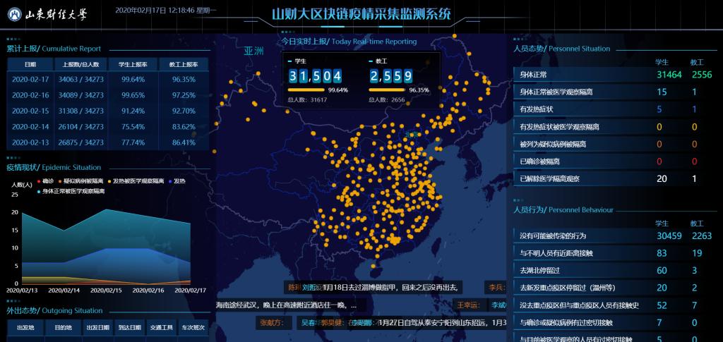 “区块链疫情采集监测系统”由山东财经大学计算机科学与技术学院、山东省区块链金融重点实验室、阿里云、山东省立医院等技术力量协同研发部署。系统上线后,学校迅速通过微信公众号、企业微信以及学校通知公告等方式通知全校师生即日开始测试填报,并自2020年2月8日起正式进行每日填报。