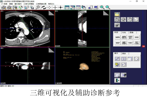 目前,利用CT数据进行肺结节/肿瘤的自动提取与辅助诊断对于临床早期肺癌的诊疗意义重大。为了有效提高诊断结果的可重复性和对于图像、疾病解释的一致性,课题组研发了该系统,满足了肺部病灶区域分析及辅助诊断、符合医生操作习惯的实时功能需求,在医学图像去噪、超分辨重建、病灶区域分割及三维可视化、矩阵快速求解及优化等关键技术方面取得了理论创新和关键技术突破。
