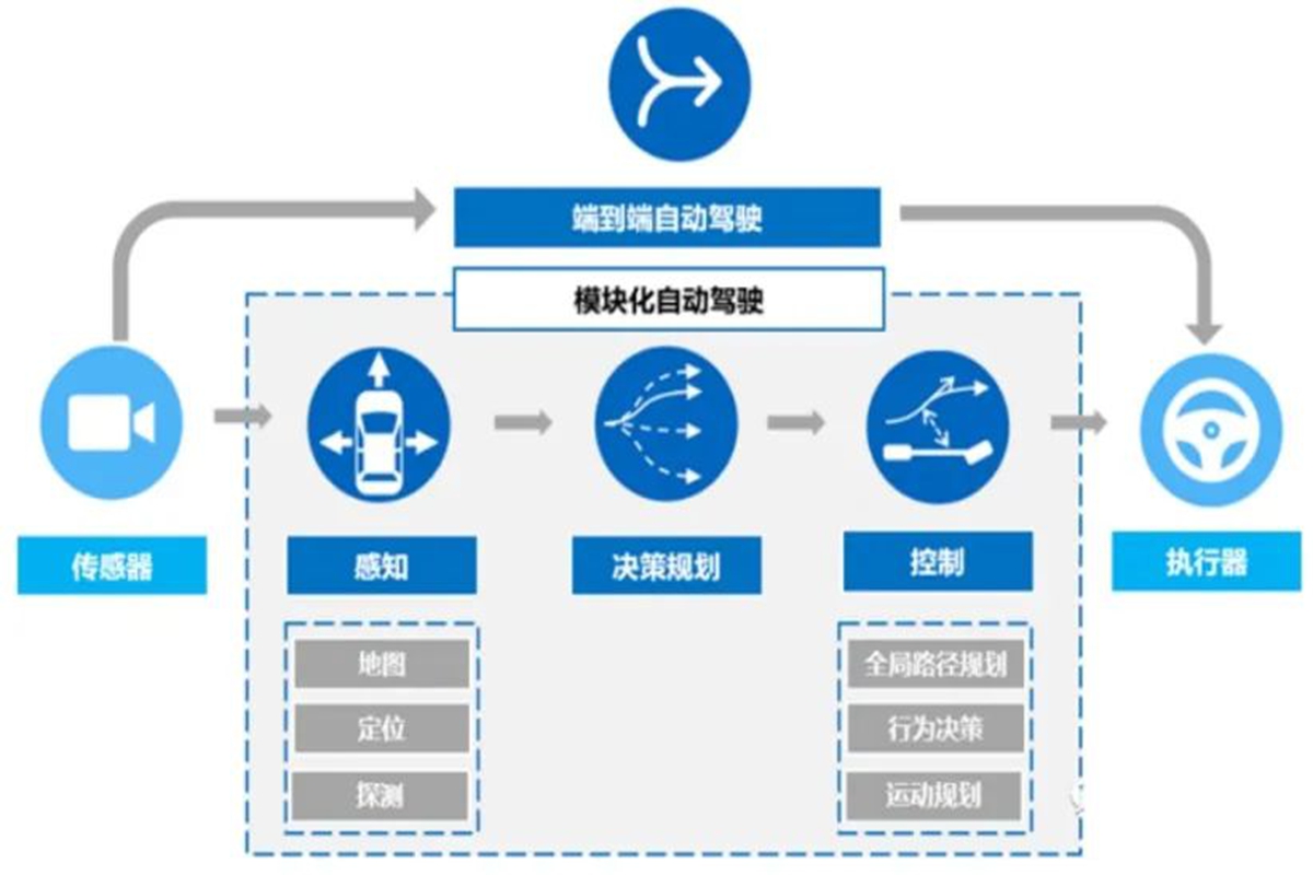 视觉领域:在自动驾驶领域,端到端意味着只需要一个模型,就能把摄像头、毫米波雷达、激光雷达等传感器收集到的感知信息,转换成车辆方向盘的转动角度、加速踏板的踩踏深度以及制动的力度等具体操作指令,让汽车实现自动行驶。