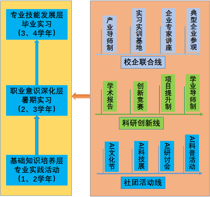 (3)个性化培养,因材施教:为满足学生多元化的兴趣和职业发展规划,课程体系设置了多个清晰的培养方向。学生可以根据自身特点和未来目标,自主选择相应的专业课程模块和特色项目。结合学院成熟的本科生创新团队培养机制,实现真正意义上的个性化培养,充分激发学生的学习潜能。
