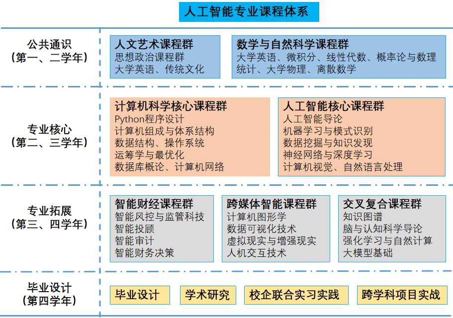 (3)专业选修课程群:包括智能财经模块、跨媒体智能模块和交叉复合模块等三个选修模块。其中,智能财经模块包含智能风控与监管科技、智能投顾、智能审计、智能财务决策等课程,旨在使学生掌握财经领域基本知识,熟悉财经行业业务流程,了解财经领域面临的人工智能相关问题及解决方案,形成人工智能与财经交叉融合的跨学科知识体系。跨媒体智能和交叉复合模块包括计算机图形学、虚拟现实与增强现实、脑与认知科学导论、知识图谱、强化学习与自然计算、人工智能伦理、大模型应用开发基础等课程,作为专业拓展类课程,介绍人工智能在理论和应用上的最新进展,旨在使学生具有跟踪人工智能最新算法和技术的能力,进一步适应现代科学技术与社会发展的需求。